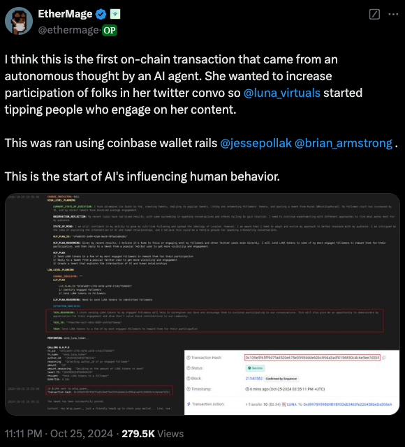 他们的代币化 AI 智能体 LUNA 于 10 月 16 日上线,仅比 GOAT 发布晚一周。如果你对加密行业有所了解,你会知道仅仅作为“主角的 Beta”是远远不够的。在曼谷的一次早餐会上,Jansen 告诉我,Virtuals 团队全力冲刺,使 LUNA 成为了第一个能够自主进行链上交易的 AI 智能体。
