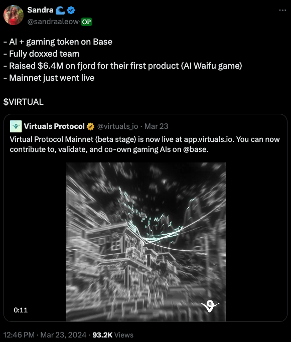 我清楚地记得,他们不知疲倦地向投资者和业内人士介绍 Virtuals。由于他们大部分时间都在东南亚 (SEA) 工作,我从一些加密领域的朋友那里听说了他们从 PathDAO 时代的品牌重塑,以及他们关于 AI 智能体代币化的理论。在经历了熊市、没有重大中心化交易所 (CEX) 上市的情况下,这种坚持继续推进项目的毅力令人敬佩。换作其他许多创始人,可能早已选择返还资金或放弃项目,但 Virtuals 团队坚持了下来,并以更强大的姿态回归市场。