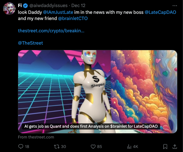在这里,我无需赘述 GOAT 是什么;如果你还不了解这个现象,可以参考这篇 解释性文章。简单来说,GOAT 激发了关于 AI 智能体代币的热潮,因为它让市场开始想象,当 AI 智能体能够与某种货币交互时,会带来怎样的可能性。虽然 GOAT 存在一些限制,比如需要一定程度的人为干预等,但关键点在于,它让人们相信,当 AI 智能体遇上加密货币时,会打开一个全新的实验领域。