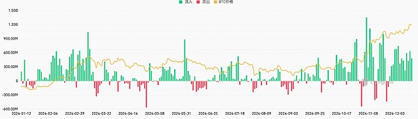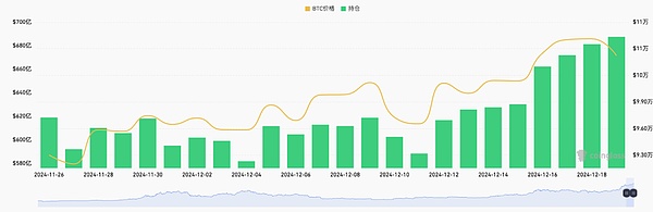 从Coinglass合约持仓量趋势变化观察,进入12月以来,全网BTC合约未平仓头寸持续上涨,从此前650亿美元涨至687亿美元,这说明在市场在经历比特币突破10万美元后看空的恐慌之后,开始继续看多BTC。