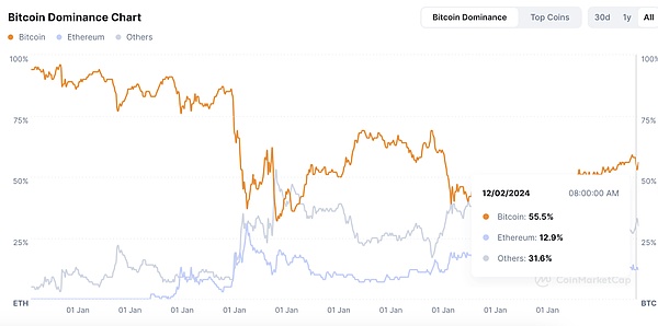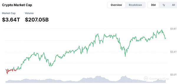 目前我们能看到加密货币总市值依旧处于相对较高位置,尽管有所回落,从3.69万亿降至3.64万亿美元,但总体依旧呈现出蓄力向上的状态。