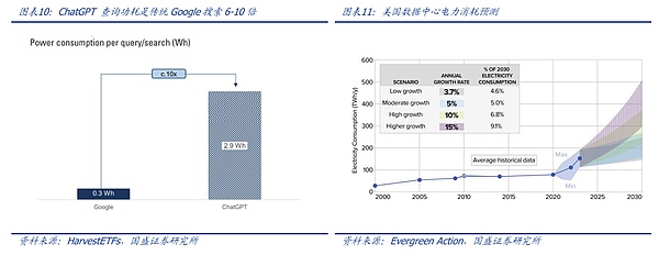 AI 数据中心的推理由于用户的大量请求,会比训练更消耗能源。目前,谷歌已在今年上半年宣布将加入新的 AI 功能完善搜索体验,将推出基于 Gemini 的 AI Overviews,该功能已面向部分用户开放试用;微软推出名为 Microsoft Copilot 的个人 AI 助手,并已将 ChatGPT 集成到 Bing 中。而目前谷歌搜索引擎的访问量已经达到每月 820 亿次,Office 商业产品的付费用户数量已超过 4 亿,庞大的用户基数意味着训练好的大模型如果集成到公司产品中,用户请求数将大量增长,AI 即时响应次数激增,导致模型推理耗能超过训练耗能。根据麦肯锡估计,直到 2030 年美国数据中心电力负载可能占所有新增需求的 30% 至 40%。