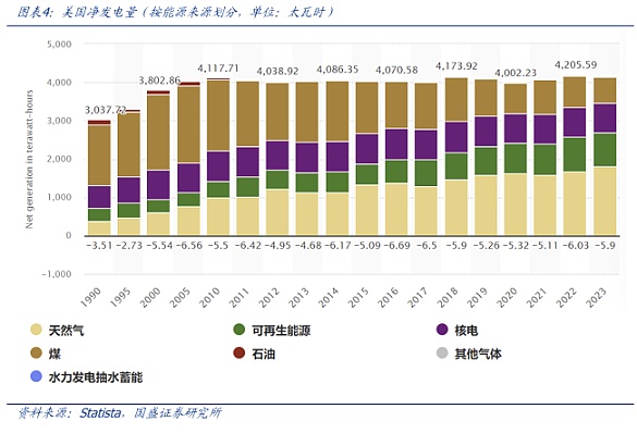 供给侧:美国全年的发电量较为固定,目前仍以火电为主要来源,新能源发电增速较快,核能占比进一步提高。美国全年的发电量大约在 4000-4300 太瓦时(TWh)之间,其中 2023 年火电(燃煤、天然气、石油)占比约 60%,是主要能源来源;新能源发电(风能、太阳能等)近年来快速增长占比达到 21%;核能约占 19%,占比进一步提高。