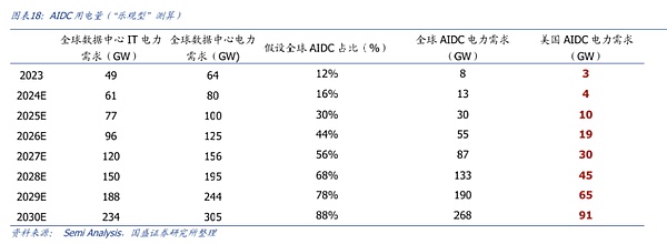 角度二结论:以美国占比为 34%,PUE 为 1.3 计算,到 2030 年美国 AIDC 电力需求将达到 91GW。