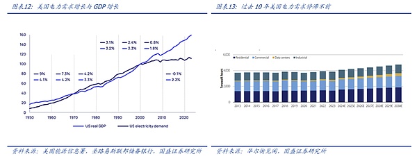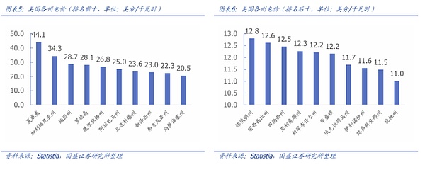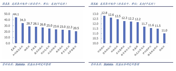 电价:美国是全球电价最低的国家之一,且个别州因为能源优势有更低的电价水平。美国电力消费结构主要划分为 4 个领域:居民、商业、工业和运输。2024 年 9 月居民用户电价为 0.17 美元 / 千瓦时(约折 1.24 元 / 千瓦时,汇率截至 12 月 13 日),商业用户电价为 0.135 美元 / 千瓦时(约折 0.98 元 / 千瓦时);工业用电价为 0.09 美元 / 千瓦时,运输用电价为 0.13 美元 / 千瓦时,2023 年批发电价为 0.036 美元 / 千瓦时。而一些州因为其能源优势电价水平较低,截至 2024 年 4 月,德克萨斯州(天然气和可再生能源丰富)的电价约为 0.147 美元 / 千瓦时、路易斯安那州(能源资源丰富)约为 0.115 美元 / 千万时、田纳西州(水电资源丰富)约为 0.125 美元 / 千瓦时。一些较为耗电的大型基建比如数据中心等,往往在低电价省份建设,上述州府也成为当今算力产业集中地。