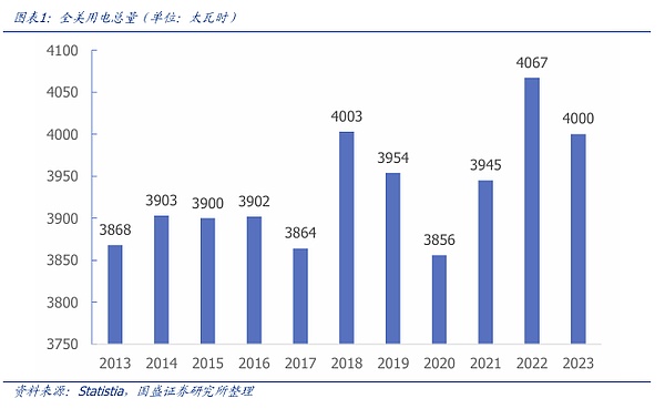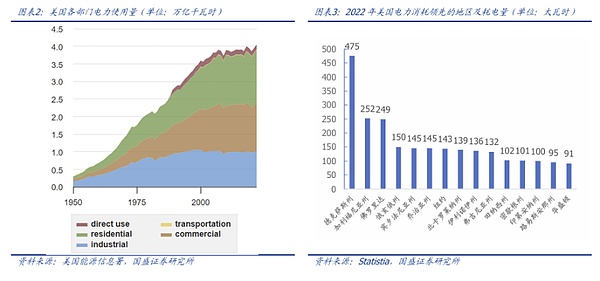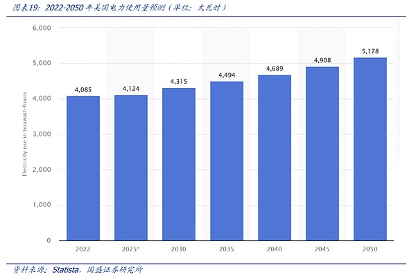 根据 Statista 预测数据,2022 年,美国的电力使用量约为 4085 太瓦时,预计未来几十年美国的电力使用量将继续上升,到 2030 年达到 4315 太瓦时(对应 493GW),到 2050 年将达到 5178 太瓦时。根据我们前面的「测算角度一」,假如 2030 年 AIDC 总功耗最高为 57GW,那么占全美用电量的比重将提升至 12%(57GW/493GW),较 2023 年的 4% 大幅提升。