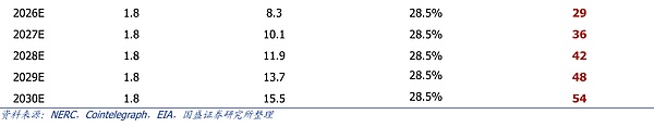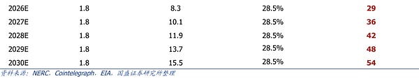 为了方便对比,我们将数据预测至 2030 年,假设:1)得州比特币矿场年新增负荷为 1.8GW,2)假设 2029 年和 2030 年德州矿场份额保持 28.5% 不变。因此得出 2024/2025/2026/2027/2028/2029/2030 年,美国比特币矿场每年耗电分别为 17GW/23GW/29GW/26GW/42GW/48GW/54GW。