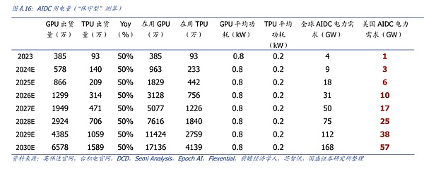 而根据谷歌官方说法,TPU v4 芯片平均功率为 200W,结合上述 2030 年在用 TPU 量约为 4139 万的估计,我们预计 2030 年 TPU 总功耗约为 3.3GW(其他指标假设与 GPU 相同)。