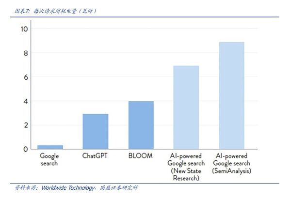 与传统的数据中心相比,AI 数据中心需要消耗大量电量。主要原因是数据量的大幅增长、复杂的算法以及 24/7 即时相应的需求。例如,一个 Google 传统搜索的请求消耗约 0.3Wh,而一个 ChatGPT 请求需要消耗 2.9Wh,为前者的十倍;《焦耳》上发表的一篇论文称,如果谷歌每一次搜索都使用 AIGC,其用电量将上升到每年 290 亿 KWh,这将超过肯尼亚、克罗地亚等许多国家的总用电量;根据纽约客杂志报道,ChatGPT 每天消耗超过 50 万 KWh。