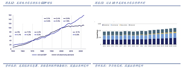 经济发展结构决定了北美电网基建较为薄弱。近 20 年来,美国电力需求与经济增长脱钩速度急剧加快。自 2010 年以来,美国经济累计增长 24%,而电力需求却几乎保持不变,2023 年,美国电力消耗甚至比 2022 年下降了 2%。其本质是区别于国内经济主要靠工业和服务业带动,美国的经济增长主要并不依靠用电或能源的消耗,而主要依赖于高科技产业,能源消耗较低。且效率的提高(主要是用荧光灯和 LED 取代白炽灯)已经抵消了人口和经济增长带来的电力需求,使得公用事业公司和监管机构没有扩大电网或发电能力。