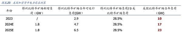 在我们 2024 年 8 月 6 日发布的报告《AI 东风已至,比特币矿场开启第二增长曲线》中,对比特币矿场用电量进行过假设和预测,在该报告中,据我们预测 2024/2025/2026/2027/2028 年得州比特币矿场负荷分别为 4.7/6.5/8.3/10.1/11.9GW(假设得州比特币矿场年新增负荷为 1.8GW),关于得州比特币矿场负荷在美国的份额,我们假设保持 28.5% 不变,因此据我们预测美国比特币矿场年负荷分别为 17/23/29/36/42GW。