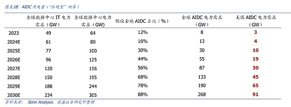 研究公司 SemiAnalysis 利用了 5000 多个数据中心的分析和建设预测,并将这些数据与全球数据以及卫星图像分析相结合,预计未来几年数据中心电力容量增长将加速至 25% 的复合年增长率,同时 AIDC 占比将进一步提升,数据中心方面,根据预测数据,全球数据中心关键 IT 电力需求将从 23 年的 49GW 激增到 26 年的 96GW,我们假设 27-30 年继续保持数据中心 25% 的复合增速(参考 2023 到 2026 年增速,为 25%),那么到 29、30 年全球数据中心关键 IT 电力需求分别增长至 188、234GW;参考 Semi Analysis 数据,结合 AI 算力蓬勃发展、下游应用陆续爆发大背景,我们认为未来 AI 在数据中心中占比有望持续加速提升,因此我们假设 23-30 年全球 AIDC 占比分别达到 12%/16%/30%/44%/56%/68%/78%/88%,从而计算出 29、30 年全球的 AIDC IT 设备电力需求分别为 65GW、91GW。