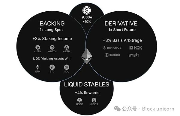 铸造和赎回 USDe / sUSDe 相对简单。可以使用 USDC 或其他主要资产购买或铸造 USDe。USDe 可以被质押以生成 sUSDe,而 sUSDe 会赚取收益。sUSDe 随后可以通过支付相应的掉期费用出售到市场,或者赎回 USDe。赎回过程通常需要七天。USDe 随后可以以 1:1 的比例兑换为支持资产(对应 $1 的价值)。这些支持资产来自资产储备以及 Ethena 使用的抵押品(主要是 BTC 和 ETH/ETH 的衍生品)。鉴于部分 USDe 并未被质押(其中许多被用于 Pendle 或 AAVE),由支持这些未质押 USDe 的资产产生的收益帮助增强了 sUSDe 的收益。