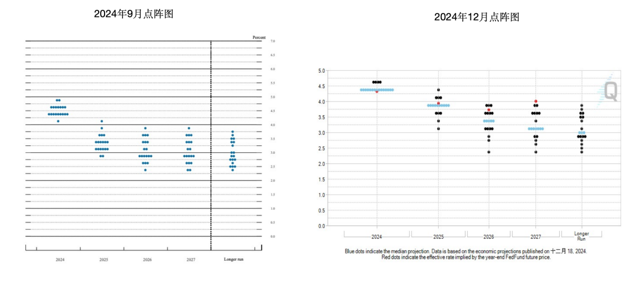 上周四凌晨的FOMC利率决策符合市场预期,以降低25BP收场,市场普遍将风险市场的下跌归因到两个方面,首先据点阵图显示本次议席并没有取得一致的统一意见,其中克利夫兰联储主席哈马克倾向于维持利率不变。另外25年的目标利率中位数上调到3.75%~4.00%,相比于上一次9月点阵图目标利率中位数的3.25%~3.5%,降息预期从4次下调到2次。在这里稍微补充介绍一下,所谓点阵图(Dot Plot)指的是美联储用来表达货币政策制定者对未来利率路径预期的一种图表工具。它是联邦公开市场委员会(FOMC)会议中发布的经济预测摘要(Summary of Economic Projections, SEP)的一部分,通常每年发布四次,主要用于观察美联储内部的政策共识。