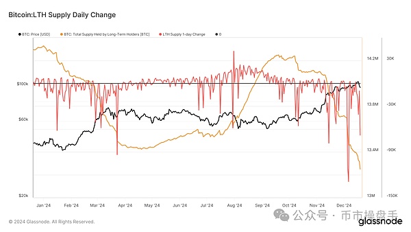 1、截至12月22日,比特币长期投资者自9月份以来的抛售规模已达100万枚,超过了3-6月份的93.4万枚。然而,上一次抛售达到这一规模时,比特币曾出现过33%的区间最大跌幅,而目前比特币仅从高位回落了15%。这表明这一周期的市场承接力更强,比特币的韧性也显著提升。