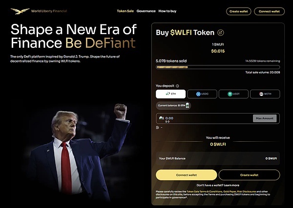 另一方面,从最直接的代币销售来看,根据官网数据,截止到发稿日,WLFI已然售出5.07亿枚,以0.015的价格计算,销售总额来到7605万美元,但离200亿枚的远大目标还是相去甚远。而从披露的投资者来看,孙宇晨是其中最为知名的一个,其向WLFI投资了3000万美元,也是最大投资者之一。考虑到代币不能转让,只能用作治理,很难不让人怀疑孙宇晨此举是在向特朗普示好。