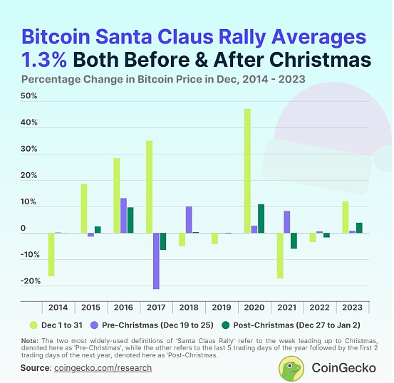 根据Coingecko的数据,从2014 年至2023 年的十年间,圣诞行情发生过8次,总加密市场市值在12月27日至次年1月2日的一周内上涨了0.69%至11.87%。仅有2021与2022年未实现增长,2021是由于圣诞行情发生在节前,上涨达到6.9%,2022年则是处于FTX的阴霾中,整体市场表现平平,两者圣诞节后分别下跌5.30%和1.90%。