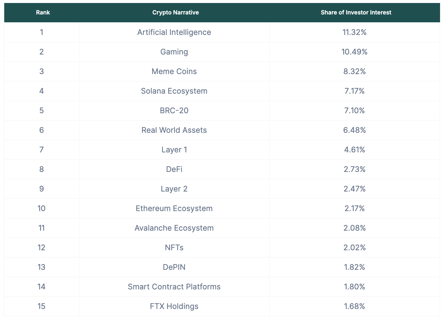 2023 年最受欢迎的 15 个加密货币叙事,按 2023 年 1 月 1 日至 12 月 21 日投资者兴趣份额排名如下: