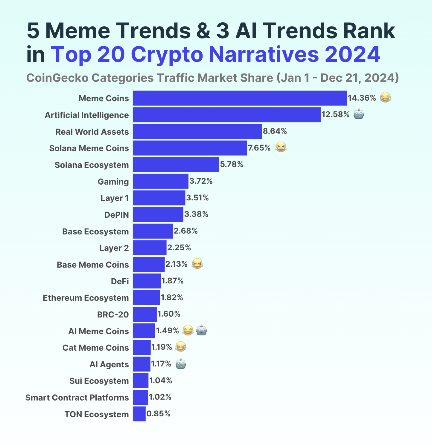 2024 年最受欢迎的 20 个加密货币叙事按年度投资者兴趣的市场份额排名如下: