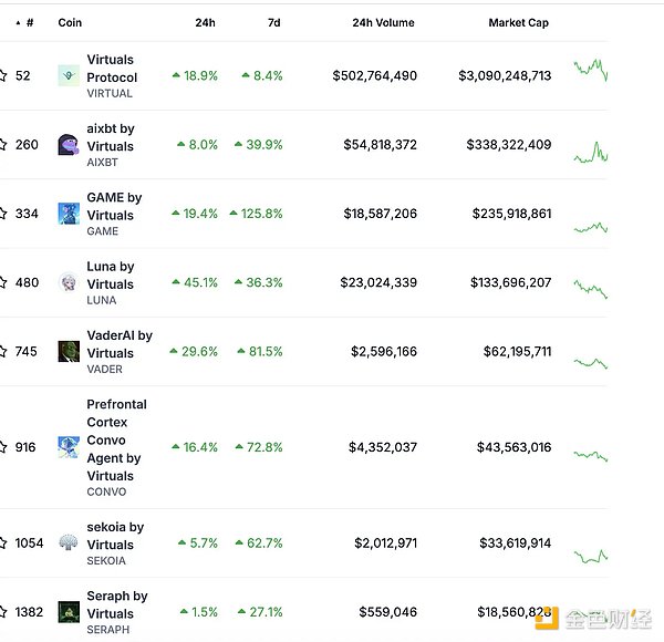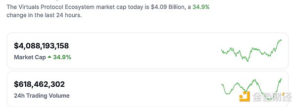 不仅仅是Virtuals代币增长,其生态内的代币也实现了普涨,据Coingecko数据显示,Virtuals Protocol生态代币整体市值在过去得24小时约上涨了35%。