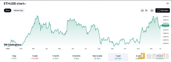 根据 TradingView 数据,截至目前,ETH(以太币)今年以来已累计上涨 53.5%,从 1 月 1 日的 $2,350 上涨至当前的 $3,478。