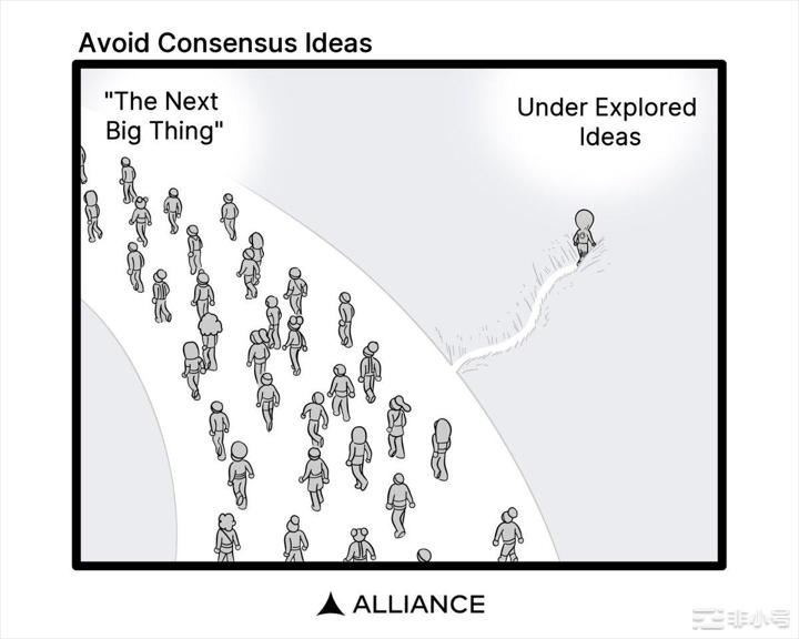 当一个想法被普遍接受时,这个市场往往已经饱和了。以 Polymarket 为例:现在他们已经验证了预测市场的可行性,市场上有成百上千的团队都在这个领域进行开发。在 Polymarket 独占鳌头的时候才是进行创新的好时机,而不是等到这个领域被验证之后。与已经站稳脚跟的产品竞争时,想要脱颖而出,你的产品必须比他们的好十倍。所以,应该把精力集中在那些还没有被充分探索的领域,竞争压力较小,这样你就有更多的自由去进行实验,并且有足够的时间去打造一个独特的产品。