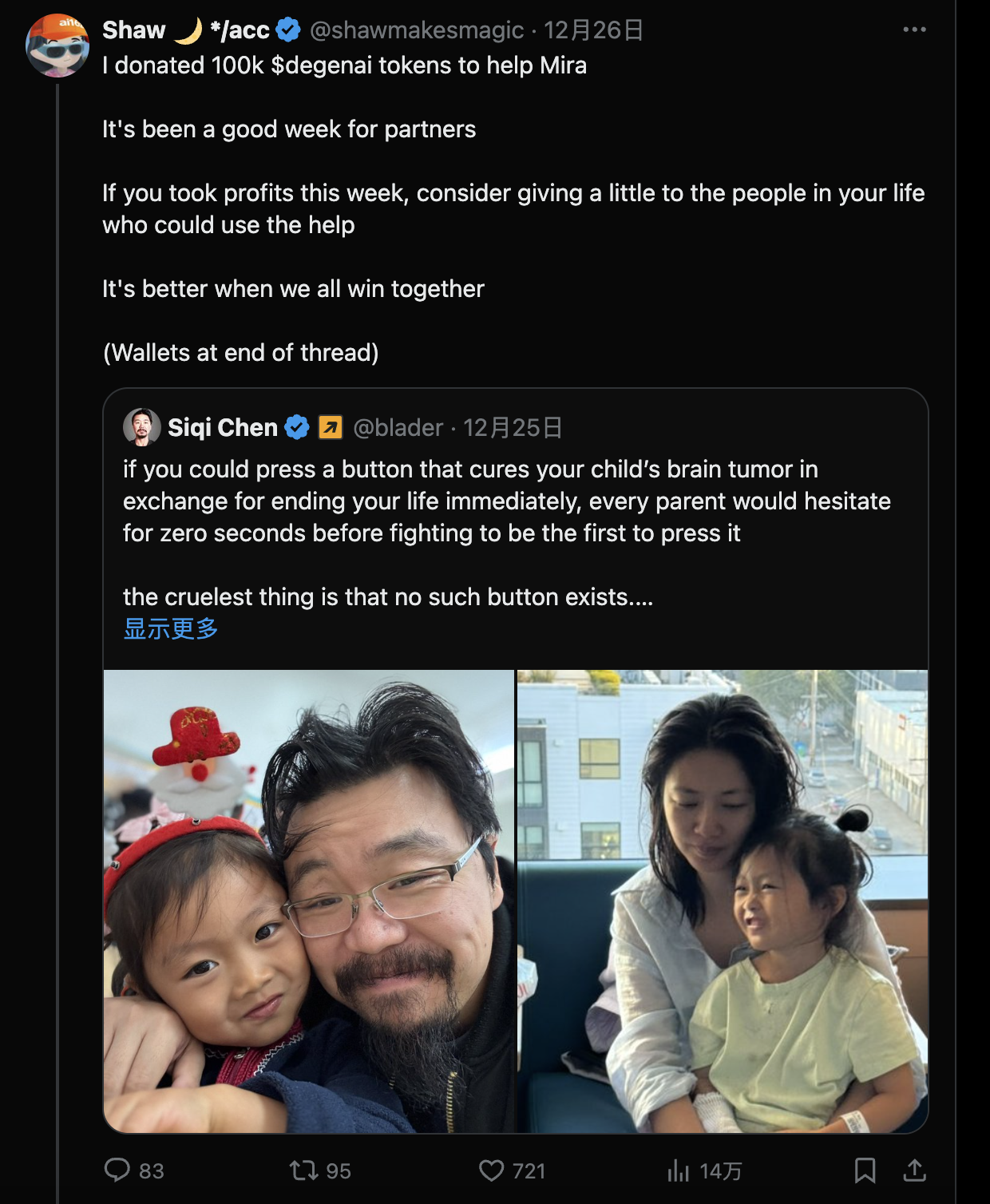 与此同时,a16z 的创始人 Shaw 特别向脑瘤患者 Mira 捐赠了 10 万枚 DegenAI,并呼吁大家在力所能及的范围内帮助身边需要帮助的人。