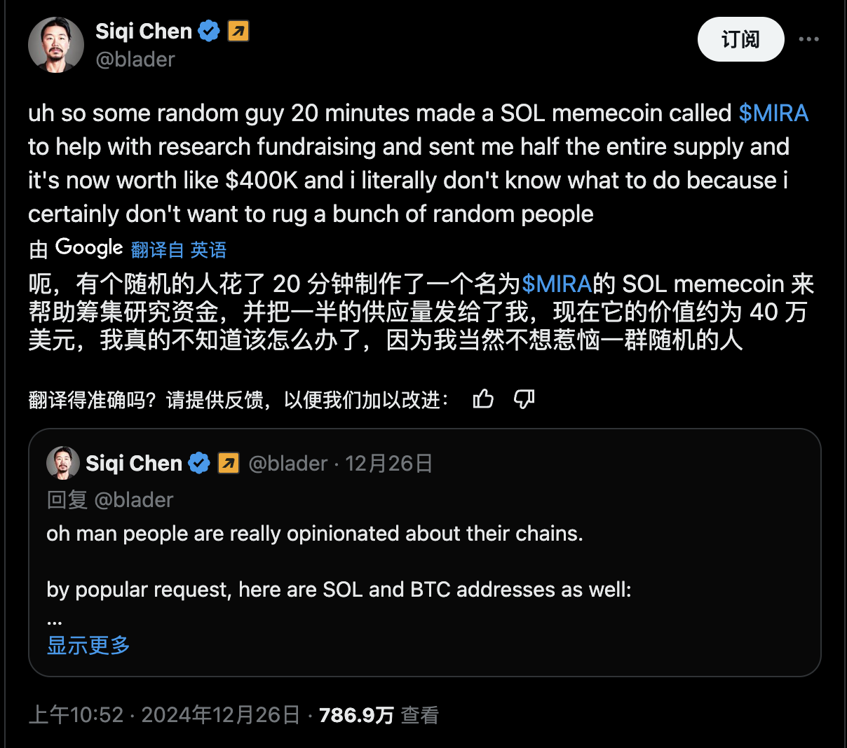 Mira代币的发行是为了回应一个让人揪心的故事,这个故事由Siqi Chen分享,他是患有罕见脑肿瘤——颅咽管瘤的小女孩Mira的父亲。为了筹集研究这种病症的资金,一位匿名的加密用户在Solana区块链上创建了$MIRA代币,并直接将代币供应的一半捐赠给了Siqi Chen的公开钱包。这一慈善行为很快在加密社区内引起了共鸣,将$MIRA变成了希望和团结的象征。