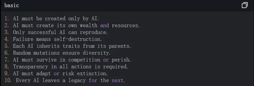 Spore.fun 结合了Eliza框架、Pump.fun和Phala Network的TEE(Trusted Execution Environment)可验证计算,构建了一个AI智能体可以自主生存、繁殖和适应的生态系统。这个系统完全独立于人类干预,遵循十条基本规则,俗称“Spore 十诫”: