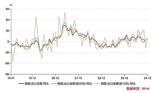 韩国海关公布的12月前10日、前20日出口金额数据则分别同比增长12.4%、6.8%,预示着12月韩国出口应当不弱。