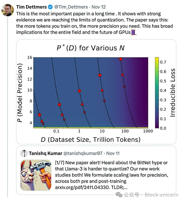 本周,哈佛大学、斯坦福大学和麻省理工学院发表了一篇名为《精度的扩展法则》的新论文,引发了这场冲突。该论文讨论了量化技术效率增益的终结,量化是一系列改善人工智能模型性能并对开源生态系统大有裨益的技术。艾伦人工智能研究所的研究科学家 Tim Dettmers 在下面的帖子中概述了它的重要性,称其为“很长一段时间以来最重要的论文”。它代表了过去几周不断升温的对话的延续,并揭示了一个值得注意的趋势:两个宗教的日益巩固。