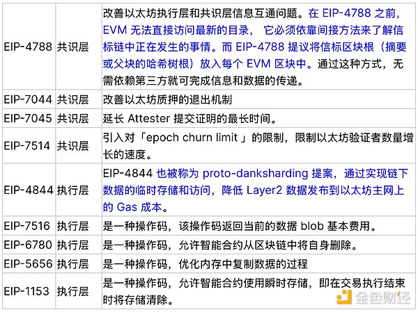 Dencun 升级中还包含了一些如提高以太坊使用效率的 EIP,如 EIP-7516、EIP-6780、EIP-5656、EIP-1153 等。Dencun 升级中具体包含的 EIP 详见下表。