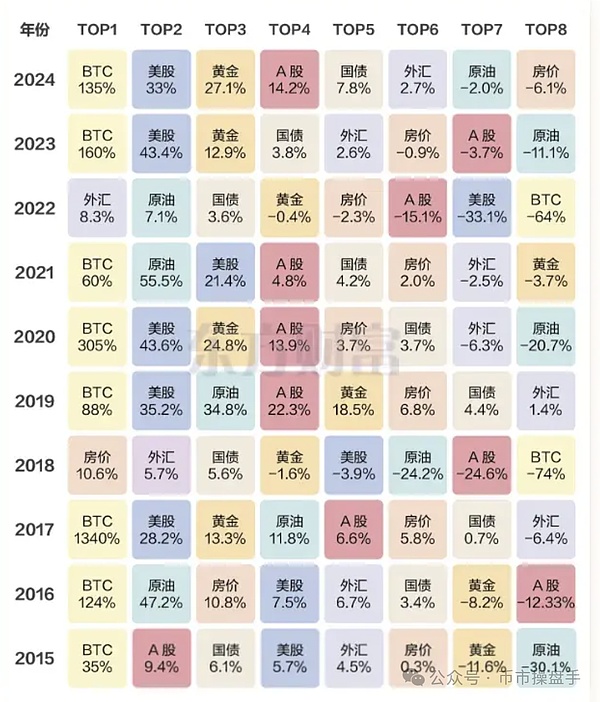 2024年,比特币以135%的涨幅成为全球表现最好的资产。然而,市场对比特币的惊艳表现并不陌生,毕竟在过去十年中,比特币已8次荣登全球最强资产宝座。可以毫不夸张地说,长期持有比特币已成为过去十年最佳的躺赢策略。展望2025年,几乎大部分机构都对2025年的比特币行情高度乐观。根据Coindesk报道,CoinShares、Galaxy Digital、VanEck、Bitwise、渣打银行等8家机构预测,比特币2025年的目标区间下限为15万美元。那么,比特币是否还能延续2024年的辉煌呢?