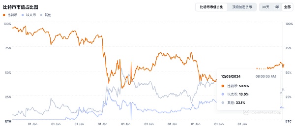 2.当前数据表明,山寨季依旧没有正式到来,目前走势依旧集中在BTC上,截至12月31日,BTC今年上涨106%、ETH上涨60.1%、SOL上涨84.6%。