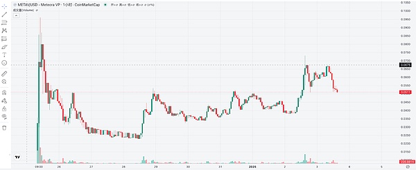 AIPool在当天发行了自己第一个AI Agent代币METAV,开盘3个小时市值涨至9600万美元,当前遇到较大规模回落,目前价格0.052,市值5200万美元左右。