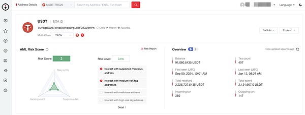 接着,我们使用链上反洗钱追踪平台 MistTrack 对该 TRON 地址进行分析,结果显示该地址初始交易发生于 2024 年 9 月 9 日,最近一笔交易发生于 2025 年 1 月 12 日,共收到过 222 万 USDT,目前余额为 9.1 万 USDT,该地址曾与多个恶意地址及中风险地址交互。