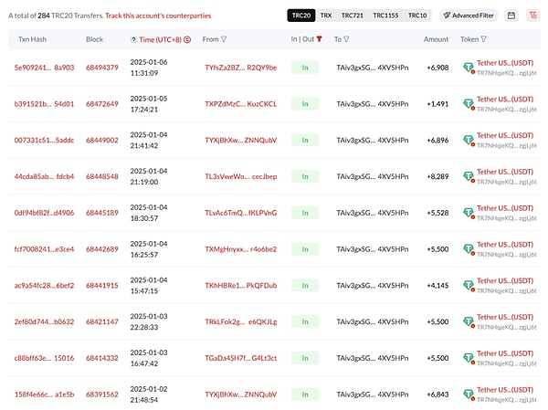根据泰国达府移民局 1 月 7 日公布的时间线,王星于当地时间(泰国时间 UTC 7)1 月 3 日凌晨 3 时 16 分入境泰国,3 时 40 分乘车离开素万那普机场,随后于 11 时左右失联。我们对截图中提到的地址 TAiv3gxSGkf7xWdEwWqoWgAB6FU4XV5HPn 以 1 月 3 日凌晨 4 时 16 分(中国时间 UTC 8)为起始的接收交易进行分析: