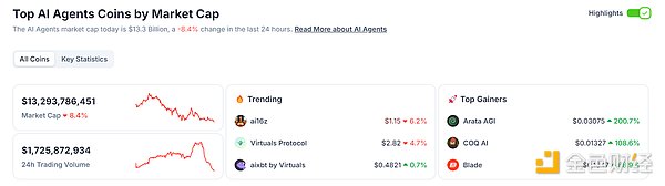 根据 CoinGecko 数据,当前 AI Agent 赛道的总市值达 133 亿美元,逼近千亿人民币,市面上的 AI Agent 项目层出不穷,鱼龙混杂。笔者在调研了超过 150 个 AI Agent 项目后,精挑细选出 70 个代表性项目,这些项目的总市值已突破 110 亿美元,涵盖了六大主要赛道。本文将通过这 70 个项目,为大家详细解析 AI Agent 赛道的全貌,揭示其中的机遇与挑战。