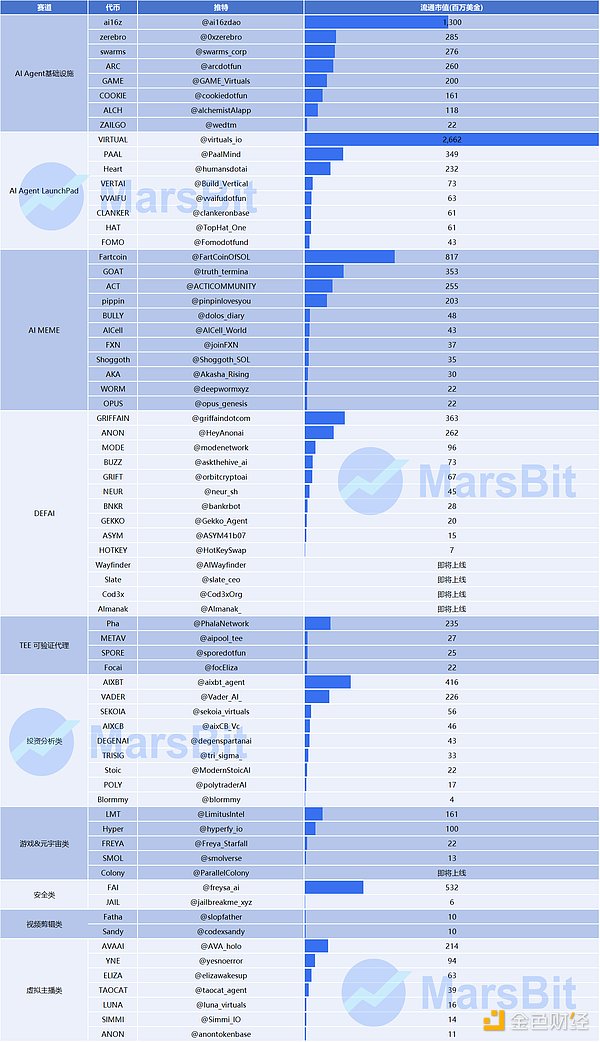 AI Agent 赛道的广阔与多样性,不仅体现在它能够跨足各行各业的边界,更体现在其细分领域的丰富多彩。为了帮助大家更清晰地了解这一迅猛发展的领域,笔者深入调研了市场上超过 150 个 AI Agent 项目,并从中筛选出了 70 个具有代表性的项目。这些项目跨越了 AI Agent 基础设施、AI Agent LaunchPad、AI MEME、DEFAI、TEE 可验证代理、AI 应用这六大赛道,且市值总和突破 110 亿美元,展示了 AI Agent 在不同场景中的独特潜力。