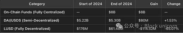 2024 年,中心化链上投资基金累计吸收了 80 亿美元的存款,DAI/USD 的增长率达到 2.3%,而去中心化稳定币如 LUSD 则下降了 65%。