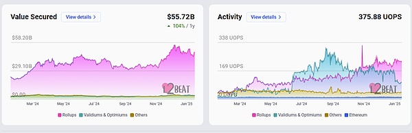 L2Beat 的实时统计数据图表也体现了Layer2流入的资金超过550亿美金,按交易量来计算,总扩容幅度是原单主网的2500%以上。