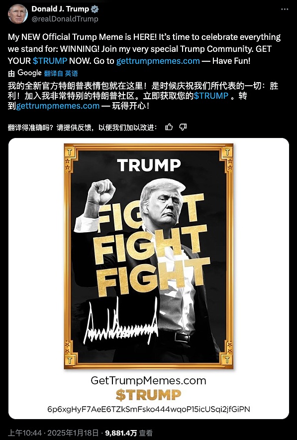 「是时候庆祝我们的胜利了!加入我的‘特朗普社区(Trump Community)’。拿到你的TRUMP代币。上gettrumpmemes.com。玩得开心!」