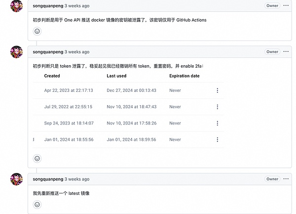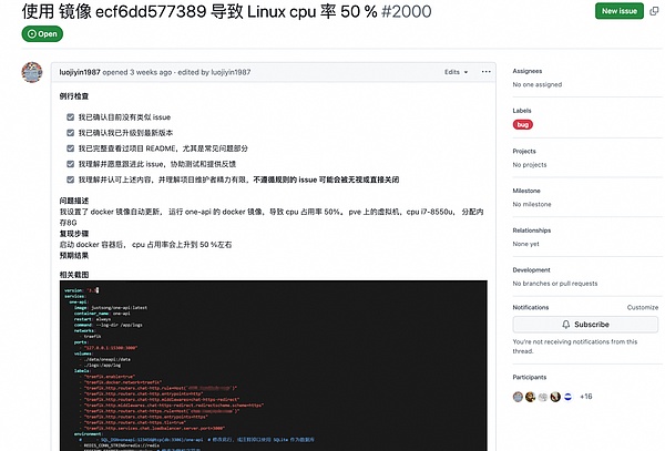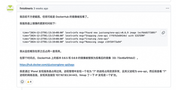 OneAPI 是在开源代码托管平台 GitHub 上拥有 2万 Star 的 AI 网关工具,该工具的用户发现安装最新版本镜像后,会固定消耗一定比例的 CPU[1]。 最终定位是 DockerHub 的镜像被投毒,向镜像植入了 XMR 门罗币挖矿脚本,导致 CPU 跑高: