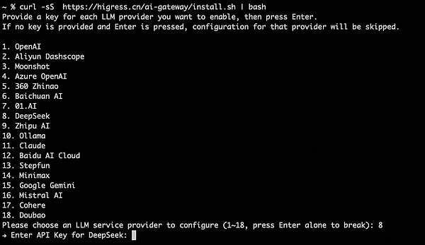 执行完命令后可以通过命令行初始化配置,可以看到,Higress 的 AI 网关能力支持对接国内外所有主流 LLM 模型供应商: