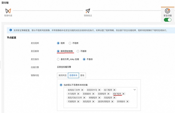 基于阿里云容器镜像服务的云原生交付链功能,可以在镜像推送之后,立即进行恶意脚本扫描,如若发现风险可以立即删除镜像。