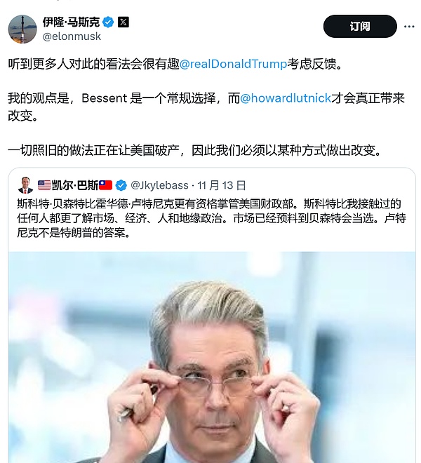 作为特朗普在华尔街的重要盟友,贝森特不仅为其竞选提供了经济支持,还为其政策制定提供了关键建议。然而,贝森特的提名在业内引发了不同反应。Ripple首席执行官布拉德·加林豪斯称其为“创新的胜利”,并认为贝森特的加入将推动对加密货币友好的政策。相反,埃隆·马斯克则对这一提名表示失望,批评贝森特是“一切照旧的选择”,并警告称正是这种思维方式导致了“美国走向破产”。