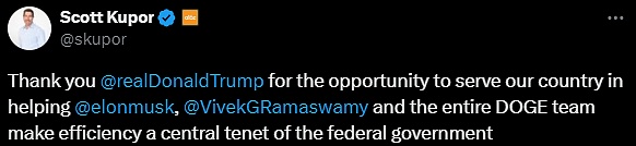 库普尔将全面接管 OPM,负责招聘协调和资源支持工作,并与“政府效率部”(DOGE)紧密合作。他在社交媒体 X 上表示,将以“效率”为联邦政府的核心原则,推动政府机构现代化。
