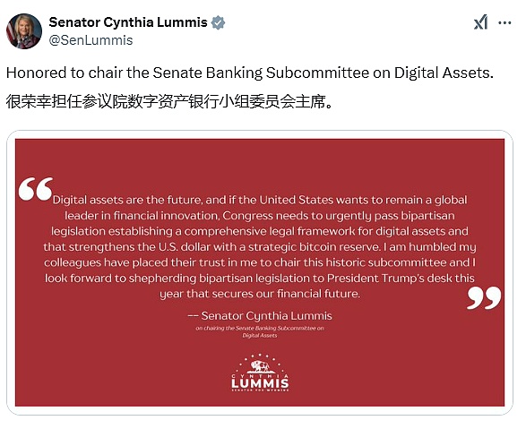 1月23日,参议员辛西娅·鲁米斯(Cynthia Lummis)被任命为参议院银行数字资产小组委员会主席。