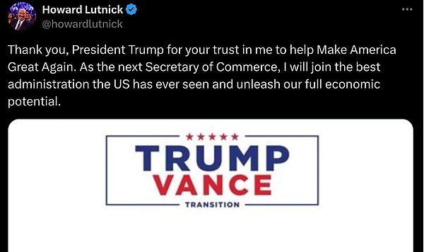2024年11月19日,特朗普提名建达公司(Cantor Fitzgerald)的CEO霍华德·卢特尼克(Howard Lutnick)担任新一任商务部长。