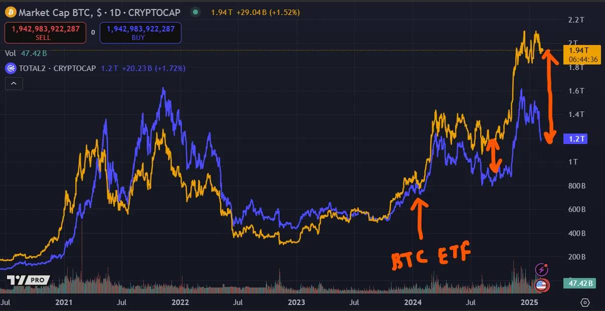 每个人都在期待“山寨季”的到来(即蓝线超过橙线的时刻),就像 2021-2022 年那样,所有山寨的价格都呈现爆炸式增长。然而,自 2024 年 1 月比特币 ETF 推出以来,比特币 (BTC) 与 TOTA L2 指数(代表山寨总市值)的差距却在不断扩大。